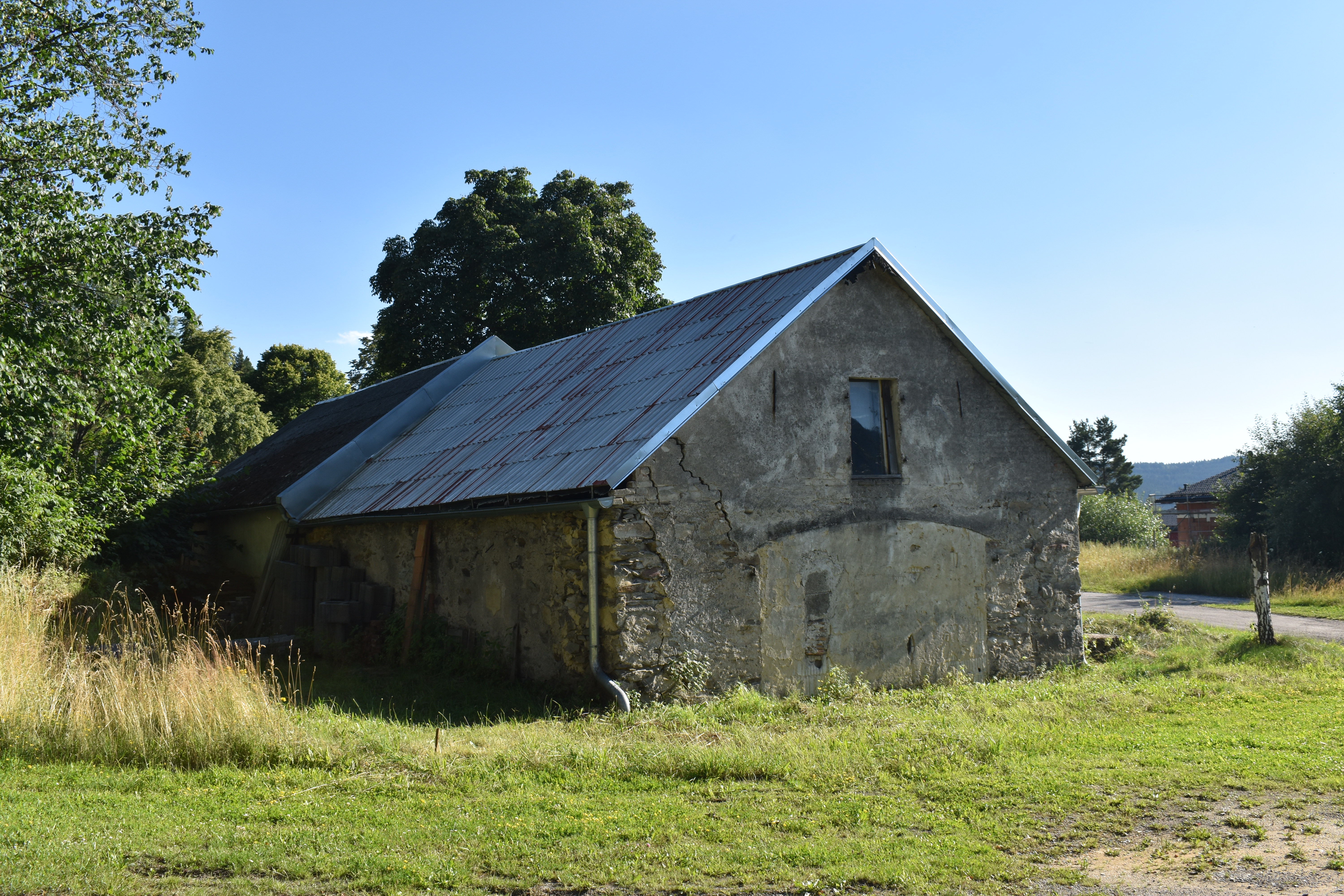 Jednopodlažní nadzemní hospodářská stavba nesloužící k bydlení o obdélníkovém půdorysu přibližných rozměrů 12,0 x 8,0 metrů. Jako zdivo je použit kámen v kombinaci s tvárnicemi a cihlami, zejména v místech ostění stavebních otvorů. Střecha je jednoduchá sedlová s prostými štíty, jako střešní krytina jsou použity velkoplošné plechové dílce. V severní stěně je patrný dodatečně zazděný stavební otvor (pravděpodobně původní vjezd do stodoly) s nízkým obloukovým překladem; stavební otvor je v současné době zazděn tvárnicemi. Po obou stranách stavebního otvoru ve stěně z vnější strany jsou zazděny původní kovové čepy závěsů vrat. V severním štítu je uprostřed jednoduché okno. Z vnější strany v blízkosti ostění okna jsou do stěny zazděny na každé straně vždy dva původní kovové čepy závěsů (pravděpodobně pro okenice). V západní stěně v pravé polovině jsou dvoukřídlá dřevěná vrata. Prostor ostění stavebního otvoru vrat je proveden z pálených dutých cihel. Zdivo po celém svém obvodu vykazuje známky statického narušení (vertikální praskliny šíře i několika cm).